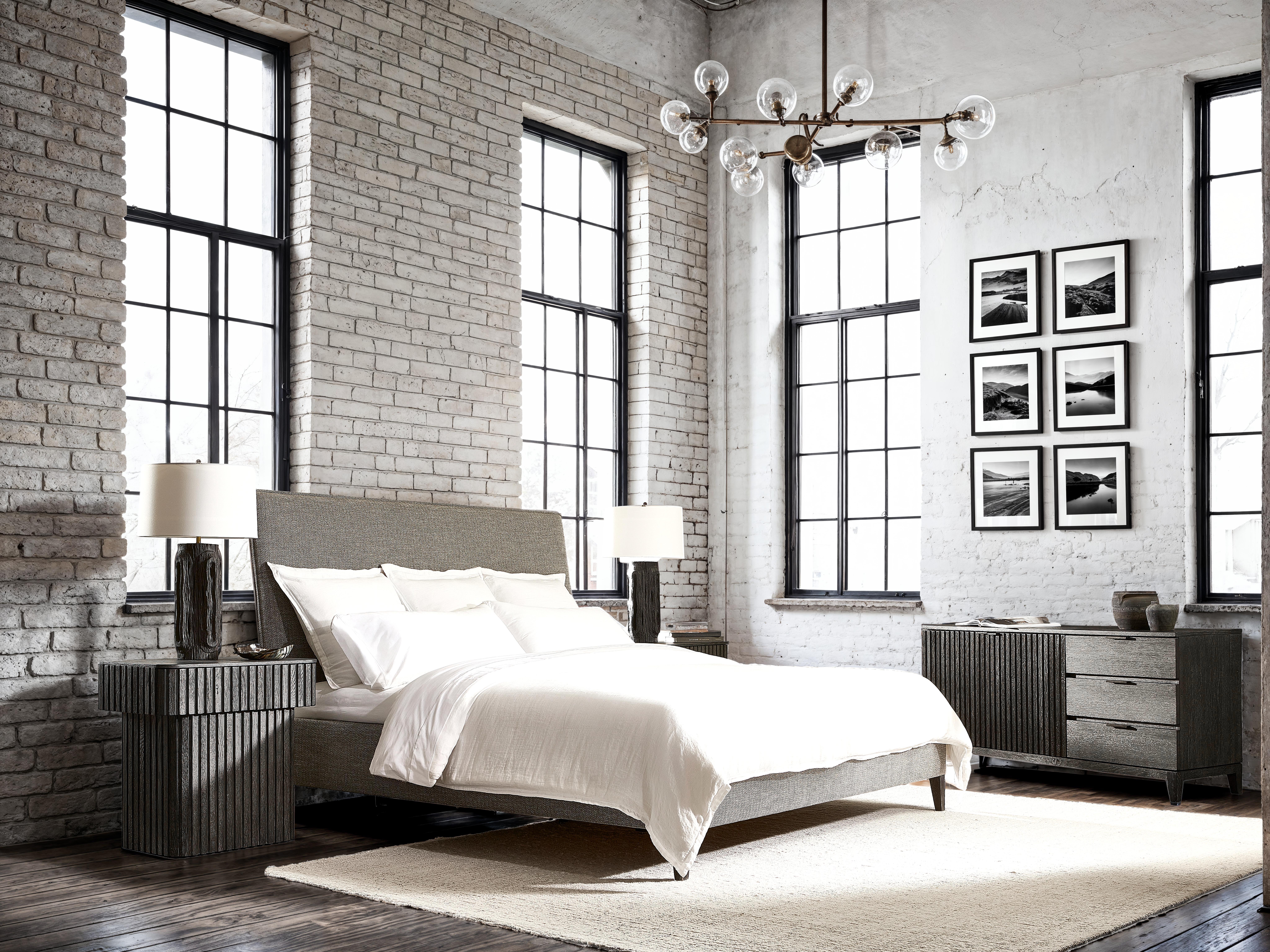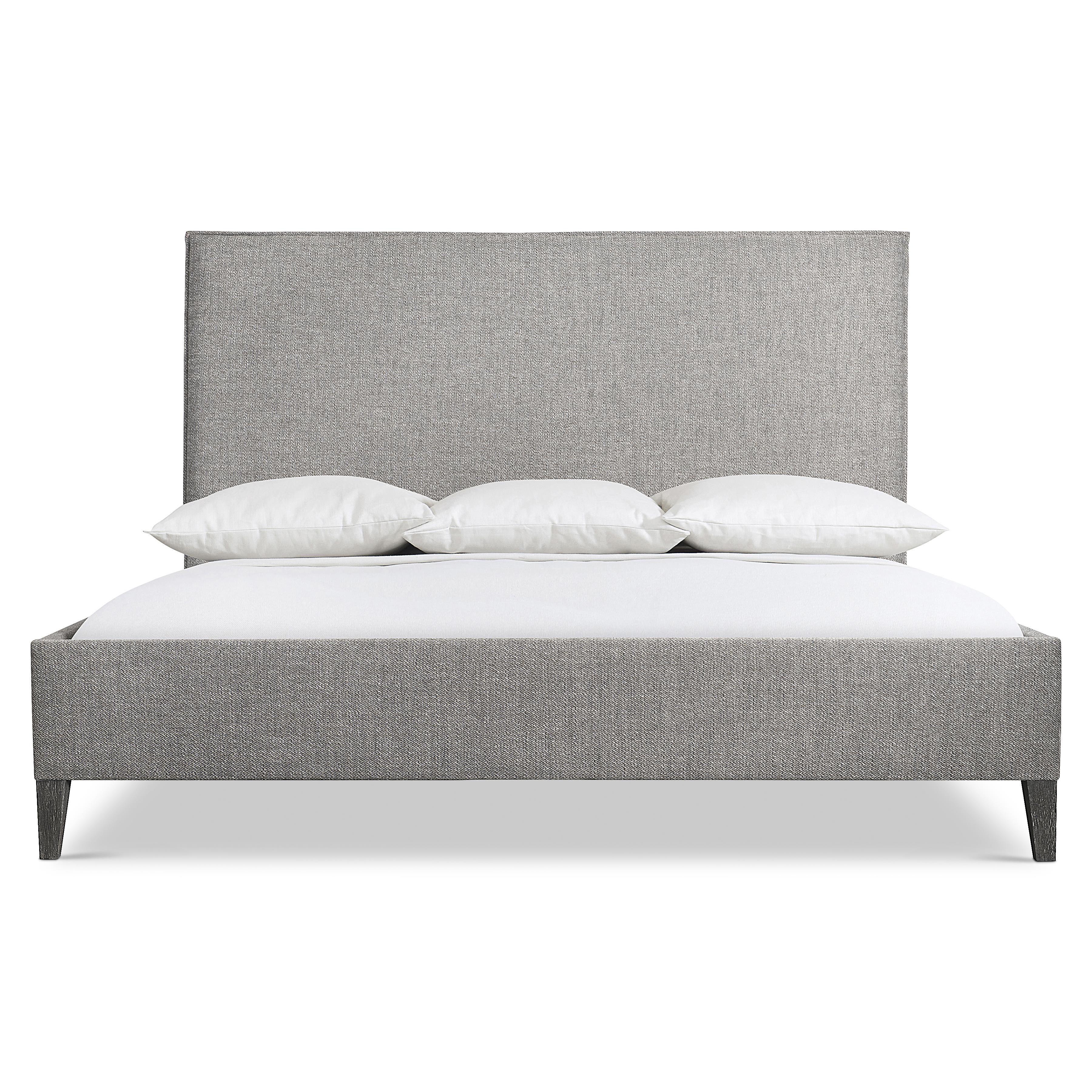 The Menton panel bed takes a modernist approach to design with clean lines and inspired architectural details. Natural textures are highlighted in the upholstered frame, which features a butterfly flange on the headboard. The exposed wood feet add a sophisticated touch in Sutton finish.