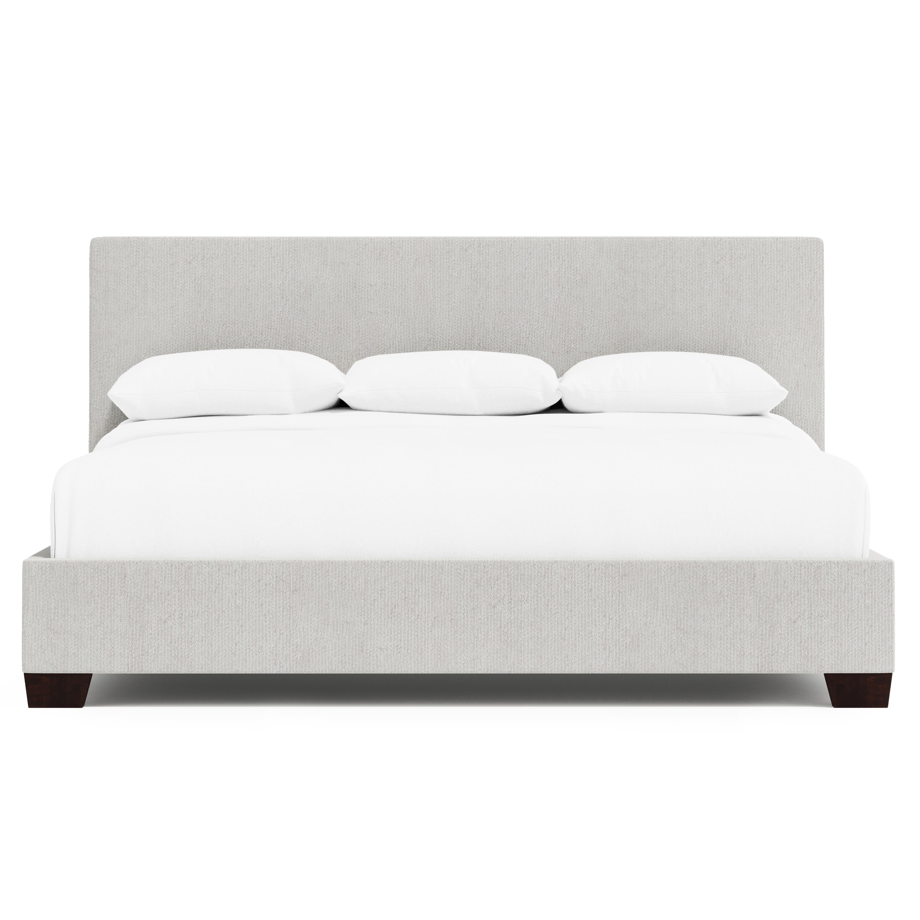 Modern and serene, the Pryce panel bed is fully upholstered with a stitched seam down the center of the headboard. Clean lines and a minimalist aesthetic create a classic, understated look. The wooden feet are available in smoke or espresso finish.