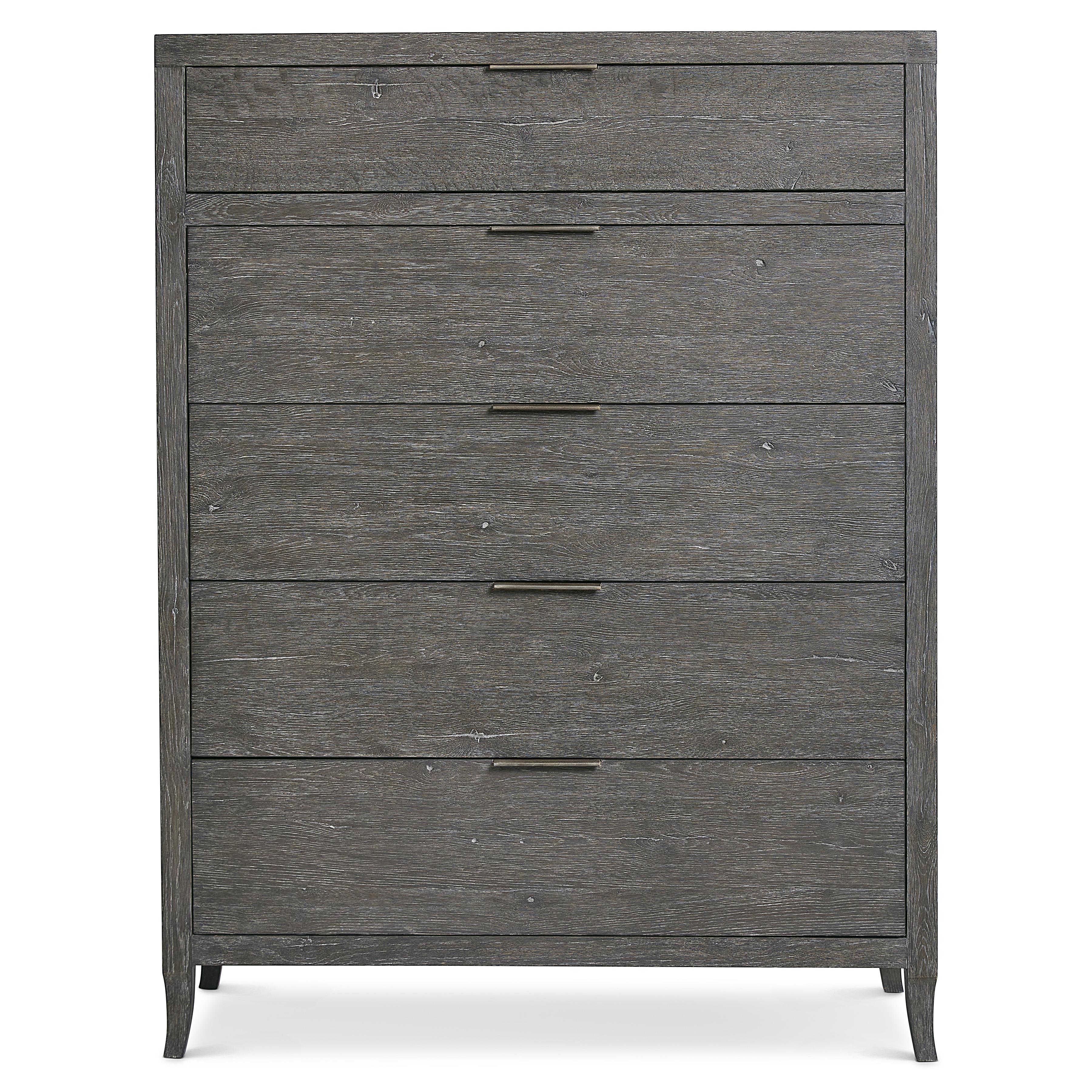 The Tribeca tall drawer chest redefines rustic modern style with simple lines and a stunning Tadon finish. The details of the wood are highlighted for a natural beauty. Each of the five drawers has a textured metal pull tab in Barlow finish.