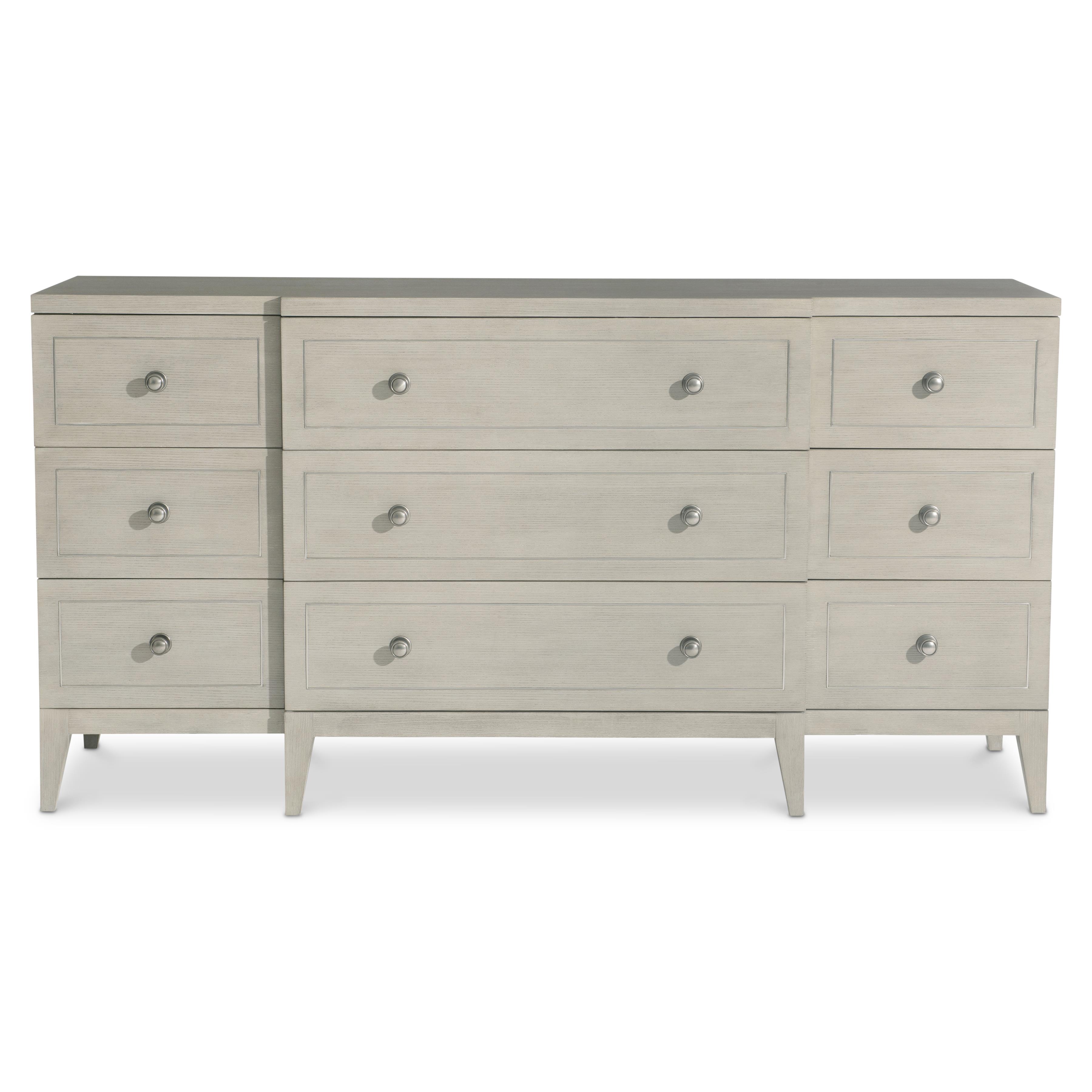 The Cornelia dresser has a traditional breakfront design that is updated for modern living with brushed stainless steel metal inlays around its nine drawers. Lines are sleek and refined, while the Nebbia finish gives the piece a more casual style.