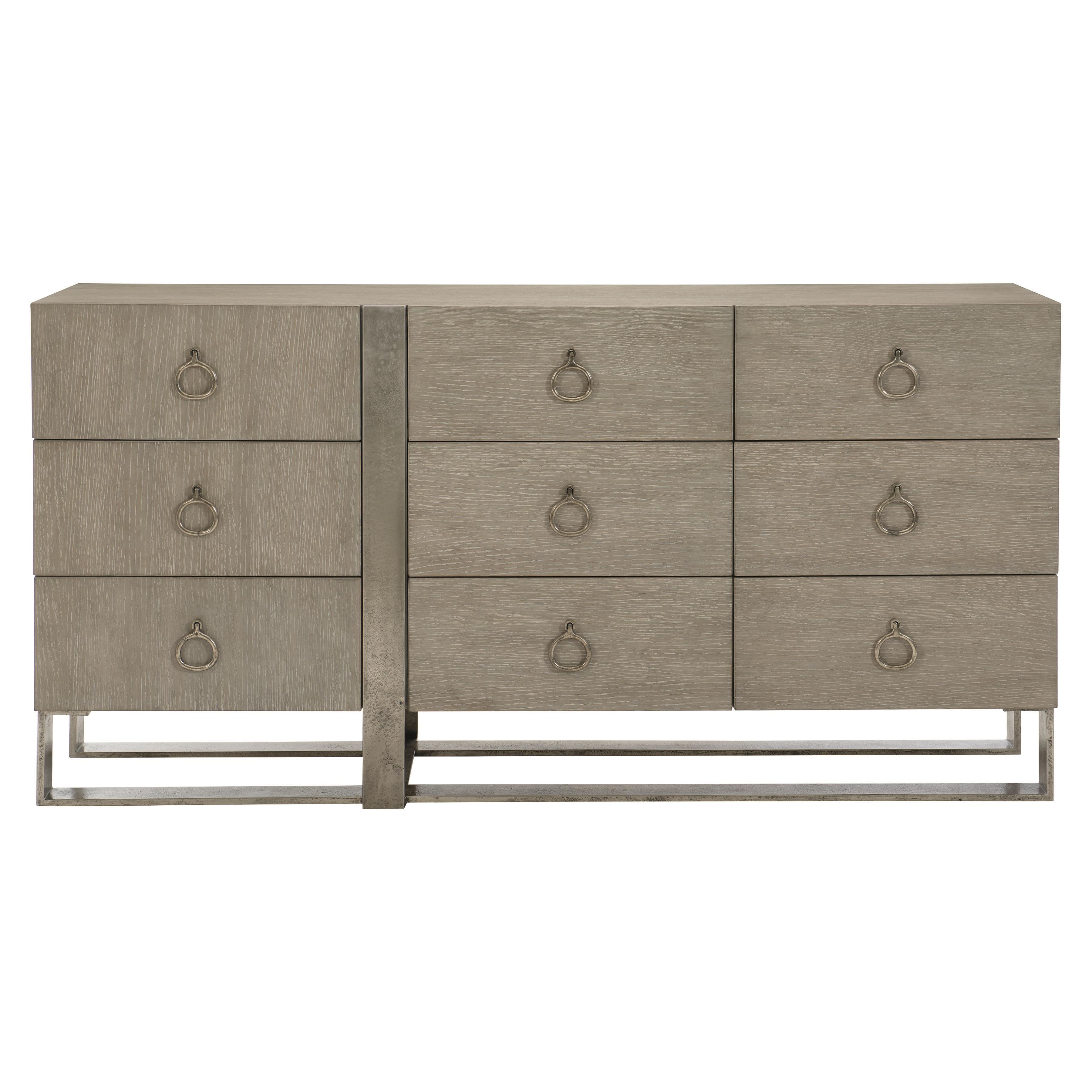 With its flawless artistry and understated elegance, Linea sets a new standard for rustic modern collections. An asymmetrical form gives the nine-drawer Linea dresser its singular look. Crafted from heavily textured metal, an open base provides support while a matching metal band wraps around the front of the case. Finished in Cerused Greige, wire-brushed oak veneers offer subtle textures. Irregular ring pulls in a Textured Graphite finish deliver a jewelry-like feel, adding to the artistic appeal of this eye-catching piece.