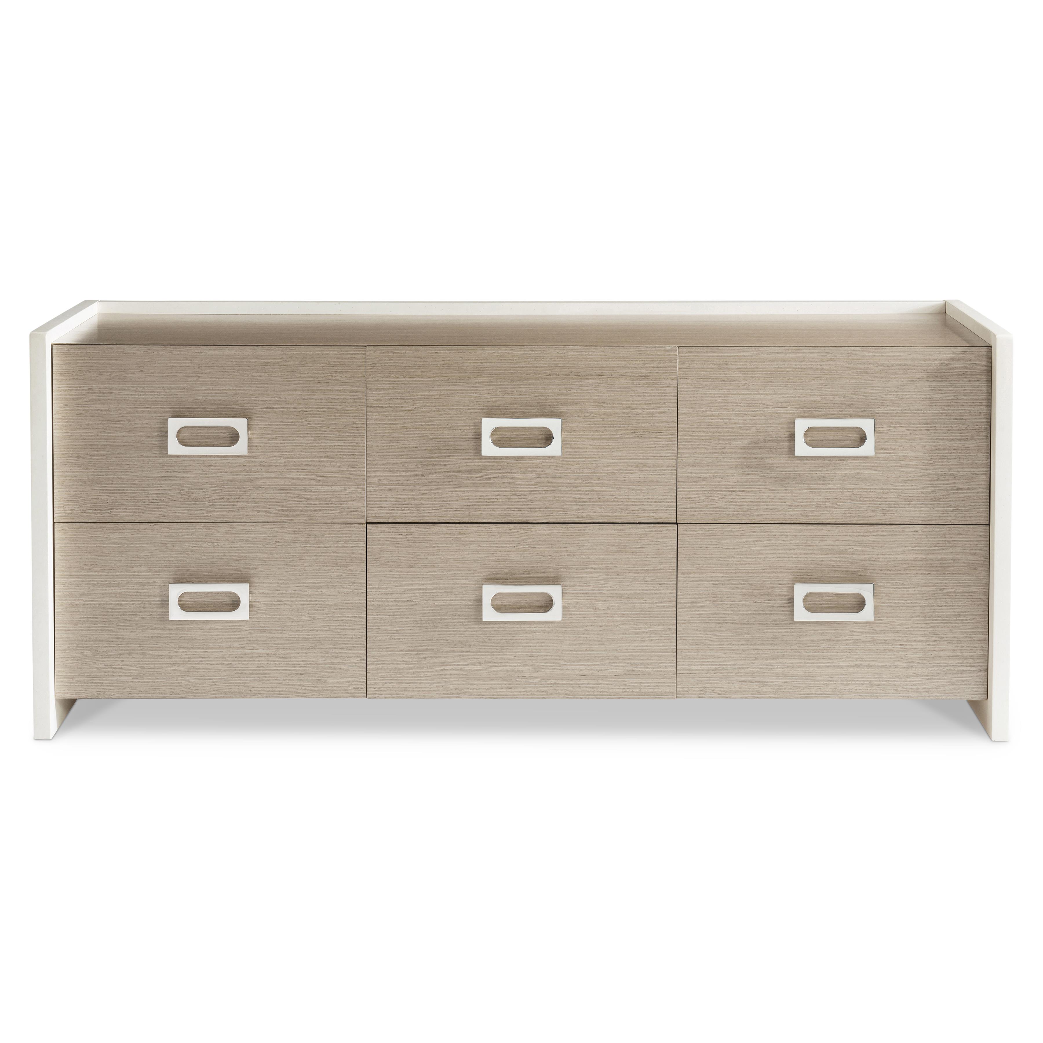 With its design inspired by midcentury modern styles, the Modulum dresser is finished in Sahara with a center case that floats between white Adobe side panels. A gallery rail around the top is also finished in Adobe. Six soft-close drawers are highlighted with metal hardware that has a distinctly retro design.