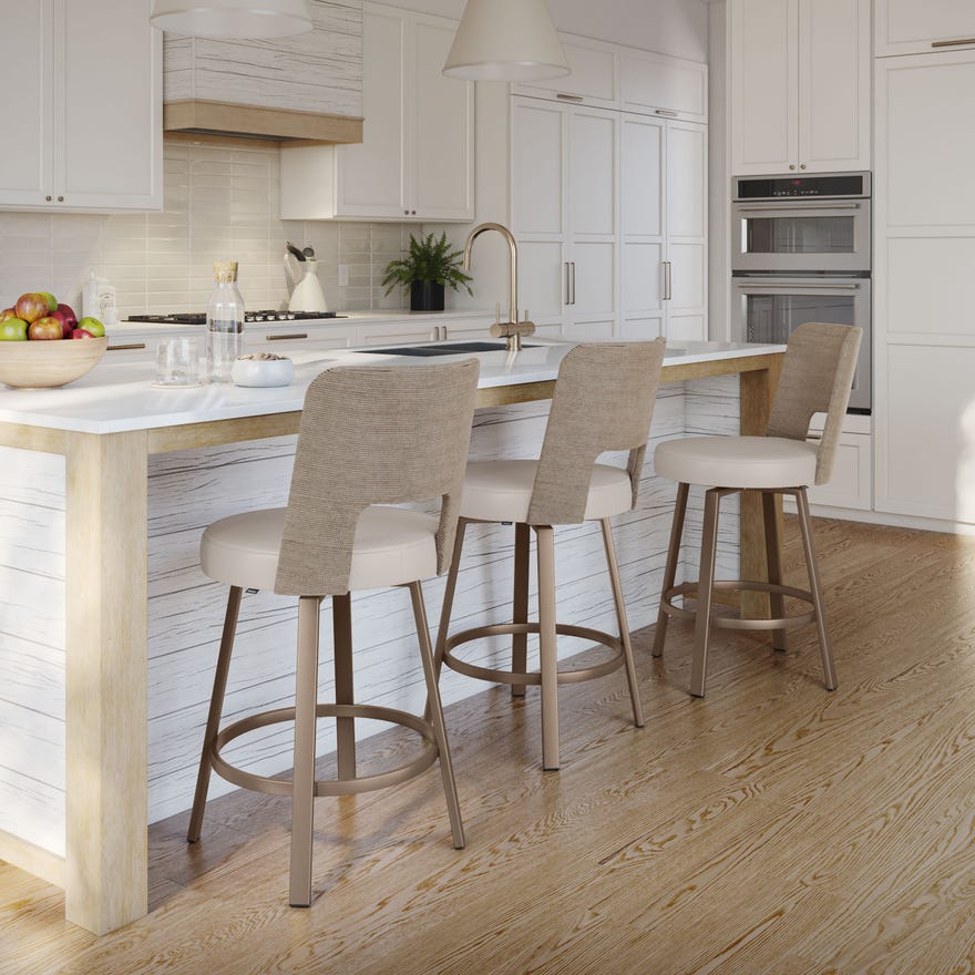The Marek swivel stool is a stunning addition to any coastal, farmhouse, or transitional kitchen. Its distinctive backrest, a work of art in itself, is meticulously handwoven from seagrass and boats a gentle curve for optimum style and comfort. Featuring a 360-degree swivel that enables smooth rotation, a cozy cushioned seat and a robust metal base, this counter and bar stool combines functionality with elegance. With its charming open-back design, it will truly stand out in your living space.